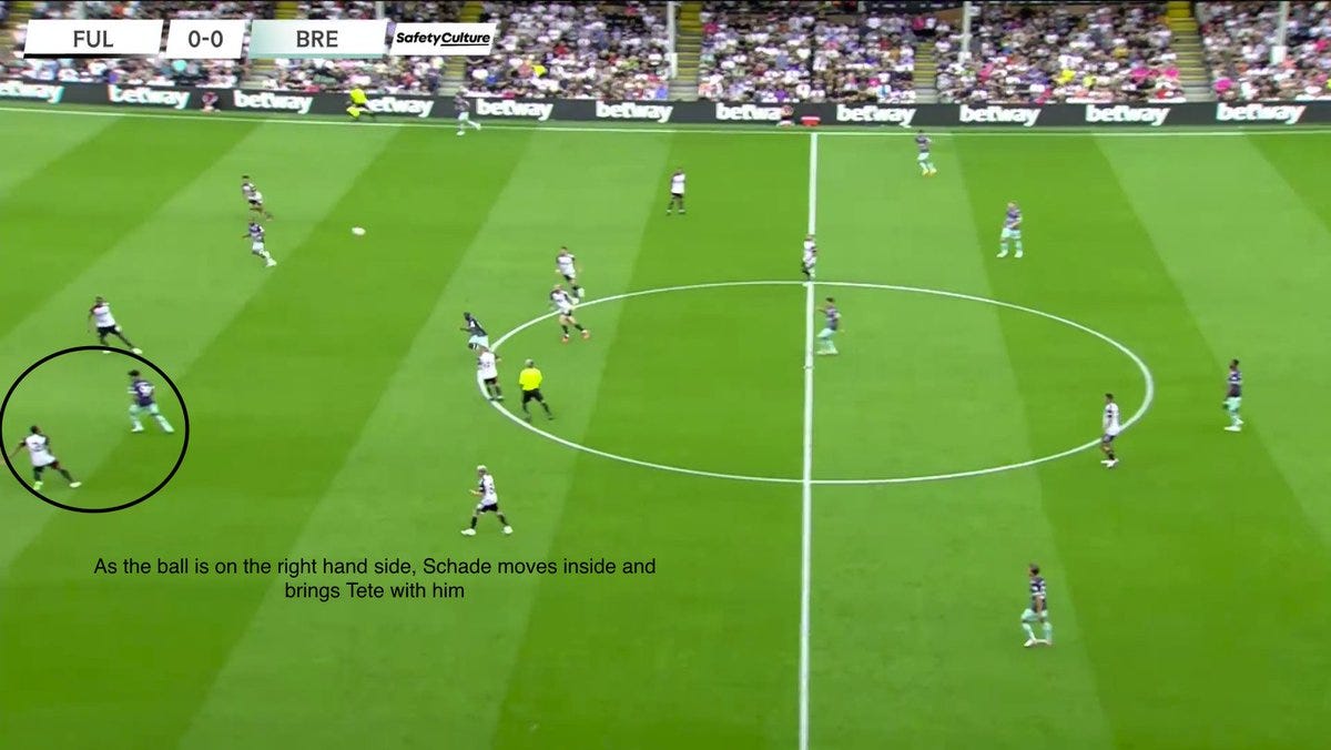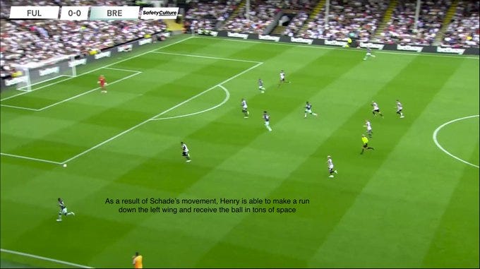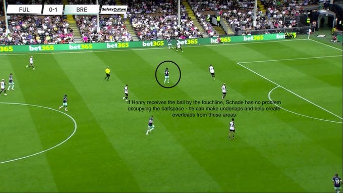 Schade is also comfortable in the half spaces and has shown this in his rotations with Rico Henry: if Schade occupies the half space, there is space left for Henry to run into. This opens up opportunities for combinations and quick overloads.