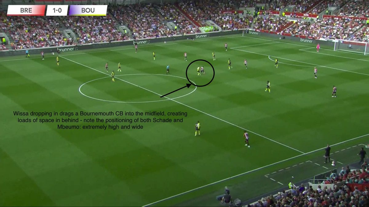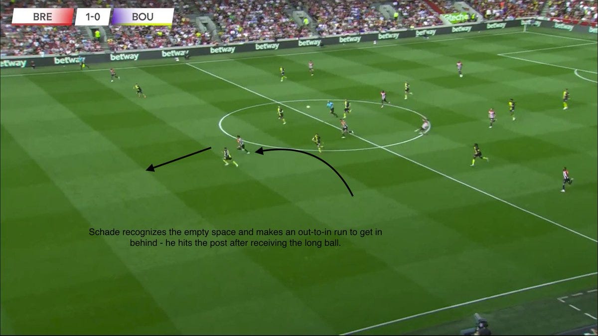 Schade is much more effective when playing a direct game - when space behind the opp. back line is exploited. I have already mentioned his utility as an outlet ball - something Brentford were not afraid to use vs Bournemouth, given his height advantage vs Max Aarons.