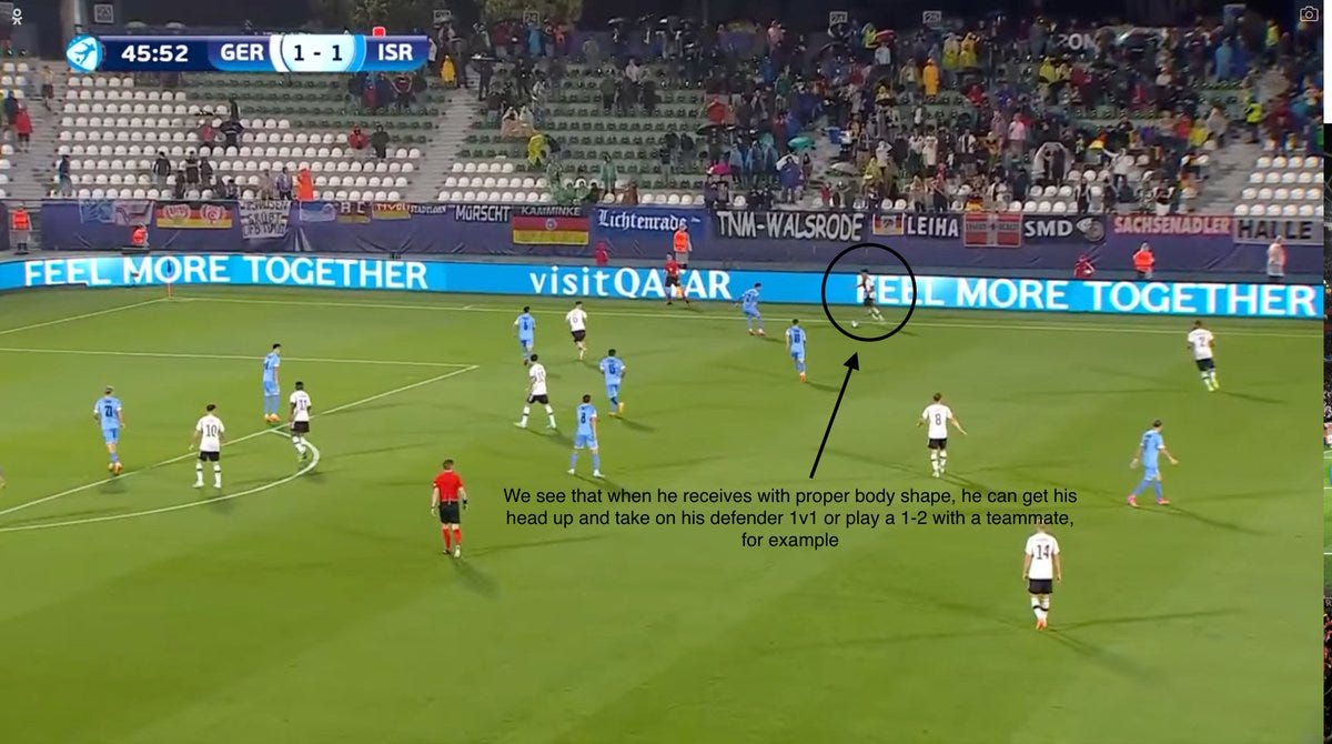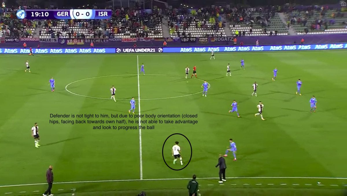 - Occasional loose first touch + body orientation: Schade's first touch occasionally lets him down - he has the chance to take his first touch past an oncoming defender but instead takes his touch towards the opponent, closing off his lane into the space and forcing turnovers. Also, his body orientation sometimes cuts off his options: he receives on his back foot but his hips are closed off and facing the direction the ball came from (away from goal). This now means his only option would be to pass the ball backwards.