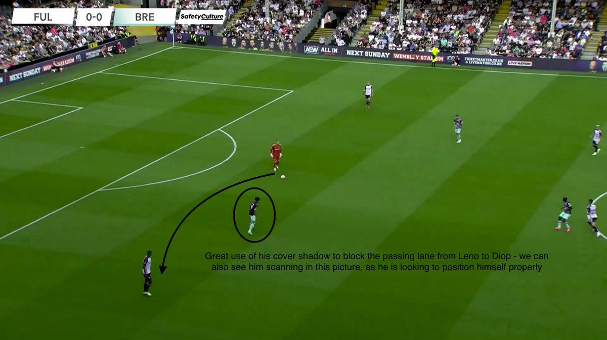 When Brentford are sitting in their 451/4141 deep block, he is used as an LM out of possession, tasked with either marking the opp. RB (when ball is near side) or tuck into mark the RCM. Schade is constantly scanning in these scenarios, showing his defensive knack/responsibility.